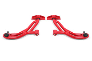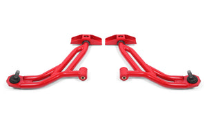 A-arms are one of the most important, yet overlooked suspension components. They are the direct link between the front wheels and the chassis. Any deflection causes a change in alignment, which results in poor performance and driving feel. Fabricated from heavy-duty 1.25-inch, 0.120-inch wall DOM tubing, deflection is eliminated with A-arms from BMR Suspension. BMR?s AA754 Lower A-arms are equipped with greasable heavy-duty ball joints, 95-durometer polyurethane bushings (front mount), and greasable Delrin bushings (rear mount) to handle the high loads. Polyurethane bushings add a solid, more responsive feel over the stock rubber bushings. BMR?s bushings are internally fluted, which allows grease to evenly coat the inner sleeve. These flutes also direct grease to the outer edge of the bushing, keeping the thrust surface lubricated. This efficient lubrication ensures quiet, reliable operation over the life of the bushings. The combination of poly and Delrin bushings gives you improved steering feel and responsiveness for any type of driving.