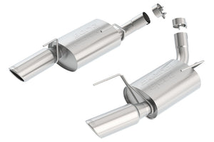 For over 4 decades, BORLA? Exhaust has been the choice of Mustang experts, from the Cobra-R SVT Mustang to the Ford GT. Major players in the racing industry and leading tuners from Roush, Steeda, Saleen and Ford Racing to the Shelby 427 Cobra have relied on BORLA?. This awesome Axle-Back system bolts on, is lighter than the factory system, includes our famous ?Touring? mufflers with outstanding flow numbers that generate great power enhancements, and features bright chrome on T-304 stainless steel tips. These attributes, coupled with an aggressive sound of power and awesome big tip, proclaim this Stang is all business. Airflow management and exhaust engineering is a science with which BORLA? has more experience than anyone in the exhaust aftermarket. The performance matches the famous BORLA? systems of the past but with a unique muffler and exhaust configuration canceling additional high frequency sound waves. Delivering a significant increase in CFM from the factory system which, as most engine builders will confirm, accounts for the dramatic power improvements. Perhaps more importantly, this added flow maximizes performance for other aftermarket enhancements installed on the Mustang because all BORLA? exhaust products are tuned for maximum output from any aftermarket performance upgrade. Two Axle-Back options are also available: an aggressive ?S-Type? (PN 11750) and a more mellow Touring (PN 11752) ? both replace only the over-the-axle pipes, mufflers and tips. BORLA?, the original pioneers of high-quality, T-304 austenitic stainless steel (superior to 409 or aluminized steel) free-flow exhaust utilizes patented award and race winning technology to deliver quality, sound, performance gains and enhanced fuel economy ? all with an easy bolt-on installation. Unsurpassed written Million-Mile Warranty.