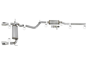 aFe's Rebel Series, dual polished tip cat-back exhaust system for your 2007 - 2018 Jeep Wrangler (JK) with the V6-3.8L / 3.6L engine. This Rebel Series system is constructed with 2-1/2" mandrel bent 409 stainless steel tubing for improved exhaust flow. Utilizing factory mounting locations, the bayonet tip hangers ensure the Rebel Series exhaust has an OE-style fit and stays put under any driving conditions. A certified craftsman hand MIG welds the system for durability and longevity. High quality band clamps and hardware to provide a quick, hassle-free installation with no modifications necessary. Dual 4-1/2" angle-cut, polished stainless steel exhaust tips are badged with laser-cut aFe POWER plates to finish off the Rebel Series exhaust system for the perfect combination of performance, value and style. Additional Performance: Compatible with aFe Power Twisted Steel Down-Pipe Loop Relocation Pipe (48-48022-HN or 48-48022-HC) to optimize your performance gain. Mild Tone: A free-flowing, sta inless steel, rear muffler assembly, engineered for the smoothest sounding performance available. A 14" long, round front muffler assembly is used to absorb the high pitch tones. The rear, 18" long, oval muffler is used to producing a powerful sound and unleashing more horsepower and torque potential. Dual 4-1/2" Polished Exhaust Tips This dual rear-exit system features 4-1/2" dia. polished, angle-cut, rolled, stainless steel exhaust tips w/ laser-cut aFe POWER badge for a custom-styled look. Installation is a snap: This Rebel Series exhaust system uses all factory mounting locations providing stability and a hassle-free installation. Perfect Fit: OE-style bayonet hangers are used to maintain a stable pipe location during any driving conditions. The bayonet tip holds the hanger bushing in place for an OE style, long lasting fit. Leak-Free Seal: High quality band clamps are used for a complete 360-degree sealing surface.