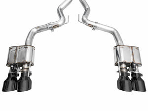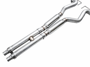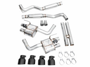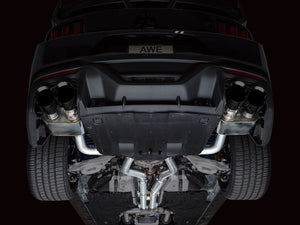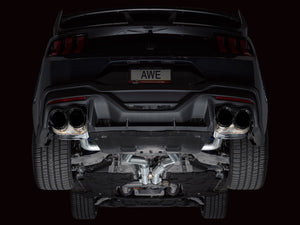 The rowdy calvary. Presenting the AWE Catback Exhaust for the Ford S650 Mustang GT. The options: SwitchPath™: two tones, one tailored package with full control. SwitchPath™ retains all of the customization of the factory active exhaust while letting the the Dark Horse’s 5.0L run free at the push of a button or drop of the hammer. SwitchPath™ is the intersection of sophistication and rage. Track Edition: for those who like their volume like their speed, the Track Edition has minimal filter in the rear via dual straight lengths of 3” stainless steel. It’s light, it’s loud (in & out), it’s cost-effective, and isn’t for the faint of heart–you’ve been warned. Full 3” & modular: each catback option features a full 3” design with modular, slip fit inlet adapters for perfect fitment with the factory headers while facilitating a dual 3” connection for drivers looking to get spicier up stream. Valved for your comfort: SwitchPath™ features tier 1 OEM-supplied valves that retain full factory functionality and behavior. Drive modes, customized settings, and programmable buttons–they’ll obey your commands. Hearty with an H: and so damn deep. Thanks to the precision H-pipe, your 5.0L V8 will produce a deep, rich muscle tone with minimal wrasp (unlike an X-pipe). Comes standard no matter the choice of exhaust. Bullets in the middle: each catback option features straight-through bullet-style resonators in the mid pipes to further defeat wrasp, especially helpful when upgraded headers are introduced into the exhaust stream. Power to the pavement: dyno-verified gains of +8 hp and +8 lb-ft of torque at the wheels on an otherwise stock vehicle. 100% emission-friendly: Touring and Track Editions do not interfere with any factory emissions equipment. Bringing up the rear: quad 5” slash-cut, double-walled tips available in chrome silver or diamond black. Made in PA, USA: engineered, designed, and manufactured in-house at AWE using US-sourced .065”-wall T304L stainless steel.