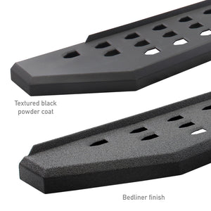 Go Rhino's legendary RB20 cab length running boards will make your truck, Jeep or SUV stand apart from the crowd. With an aggressive, yet stylish appearance, these bolt-on steps take their visual inspiration from the Ford Raptor but are made for more than just looks. The RB20's perforated holes, punched into the surface of the step, gives maximum traction and prevents mud, ice, and snow from accumulating. The corrosion-resistant 16-gauge steel steps are mounted high and tight, giving them plenty of clearance for off-roading, and are strong enough to support hundreds of pounds. The RB20 is offered in textured black powder coat or bedliner coating. Matching drop steps will make entering and exiting lifted vehicles even easier. Hardware and brackets are included. RB20 Running Boards With Drop Steps come with a Limited Lifetime warranty on materials and construction and a 5 year warranty on the the Bedliner finish.